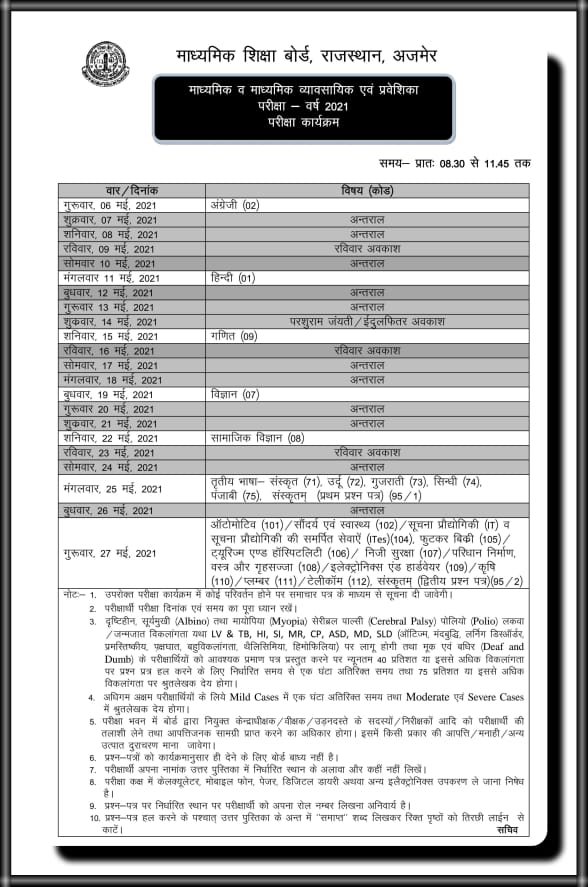 अजमेर 25 फरवरी राजस्थान माध्यमिक शिक्षा बोर्ड ने वर्ष 2021 की मुख्य परीक्षाओं का